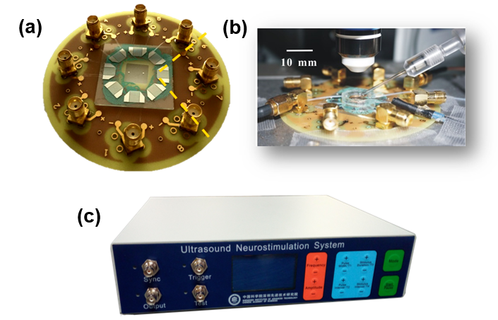 图1. (a-b)微尺度超声神经刺激芯片和(c)便携式单通道小动物超声神经刺激仪
