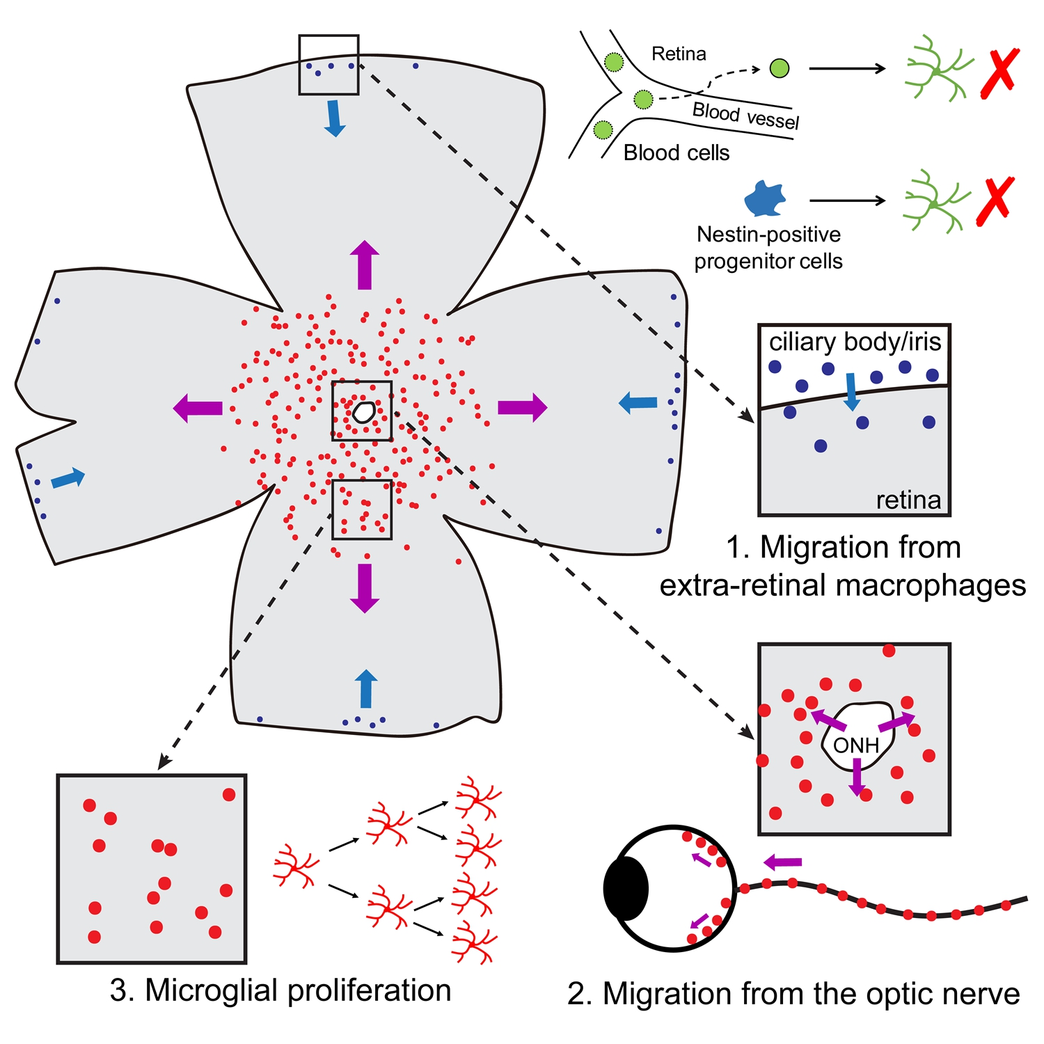 图3 视网膜内再殖小胶质细胞的起源模型。