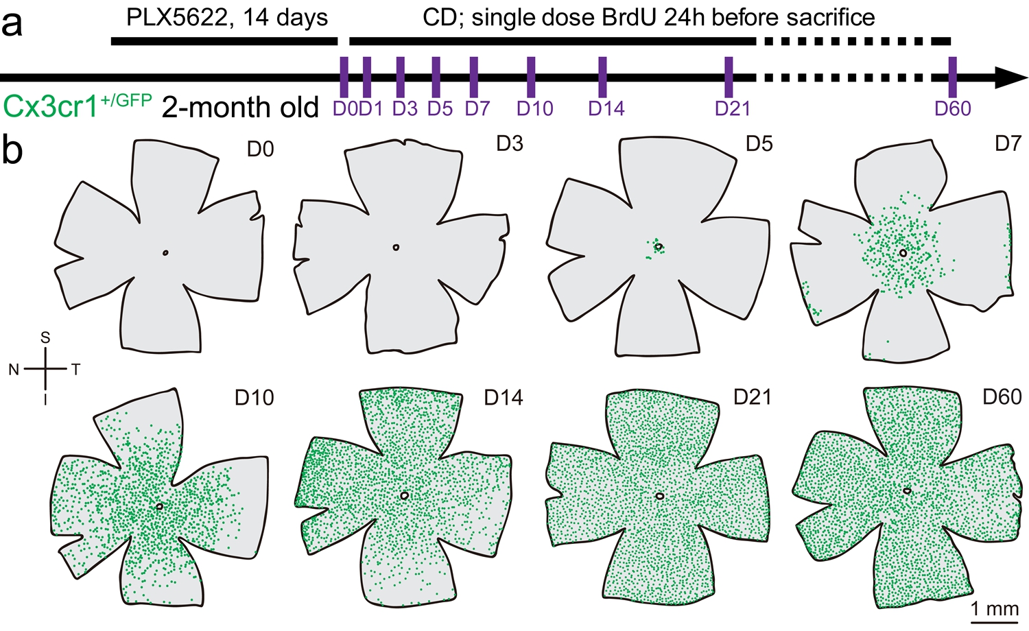 PLX5622:混有CSF1R特异性抑制剂PLX5622的鼠粮。CD:对照组正常鼠粮。其中每一个绿点代表一个小胶质细胞。