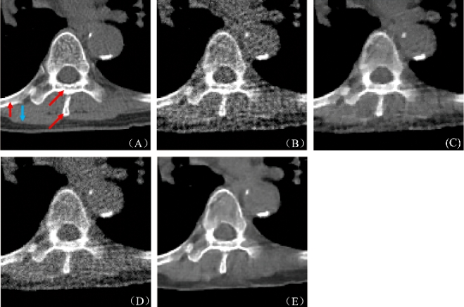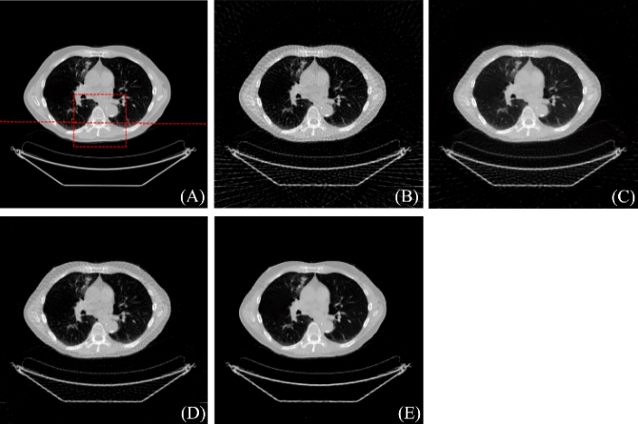 图2:重建结果. (A) 参考图像, (B) FBP重建结果, (C) PWLS-TGV重建结果, (D) R-NLTV重建结果, (E) DD-Net重建结果