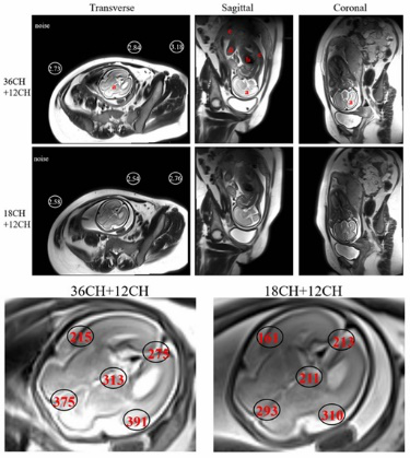 图2 设计的36通道线圈(结合12通道脊椎线圈)与商用的18通道线圈(结合12通道脊椎线圈)的胎儿大脑(2倍加速)成像结果对比,36通道线圈可以明显提高图像信噪比,高达40%左右。