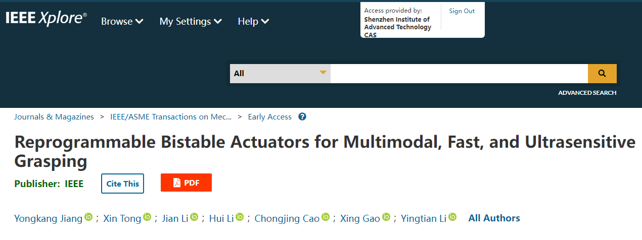 近日,中国科学院深圳先进技术研究院生物医学与健康工程研究所微创中心李英田副研究员课题组,与同济大学、北京邮电大学在《IEEE/ASME Transactions on Mechatronics》上合作发表了题为"Reprogrammable Bistable Actuators for Multimodal,Fast,and Ultrasensitive Grasping"的文章。中国科学院深圳先进技术研究院为唯一完成单位,李英田副研究员为主要通讯作者。