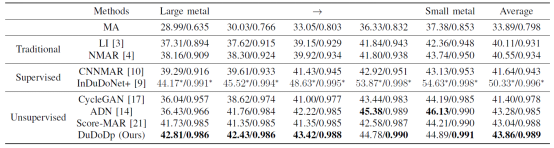 图3. 不同金属伪影去除方法的PSNR/SSIM比较,其中粗体表示在无监督方法中的最佳结果,星号(*)表示包括监督方法在内的最佳结果。