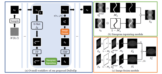 近年来,许多基于监督深度学习的方法已经被提出用于金属伪影去除。然而,这些方法在很大程度上依赖于使用成对的模拟数据进行训练,而这种数据往往难以获取。在本文中,研究者提出了一种基于扩散模型先验的无监督金属伪影去除方法,扩散模型是一种具有数据分布表示能力的生成模型。具体地,先使用不含金属伪影的CT图像训练扩散模型;随后,在投影域和图像领域中迭代地引入扩散模型先验,以恢复由金属伪影引起的退化部分。方法流程图如图2所示。本文的方法在性能上胜过现有的无监督金属伪影去除方法(图3-图4)。