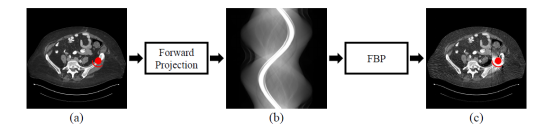 图1. (a)表示病人体内的金属植入物;(b)表示被金属影响的CT正弦图;(c)表示有着严重金属伪影的重建图像。